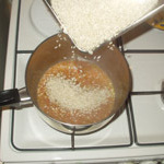 .Toaster le Riz : Le riz est ajouté au soffritto et toasté pendant quelques minutes en remuant. Cette étape fixe l'amidon et améliore la texture finale du risotto.